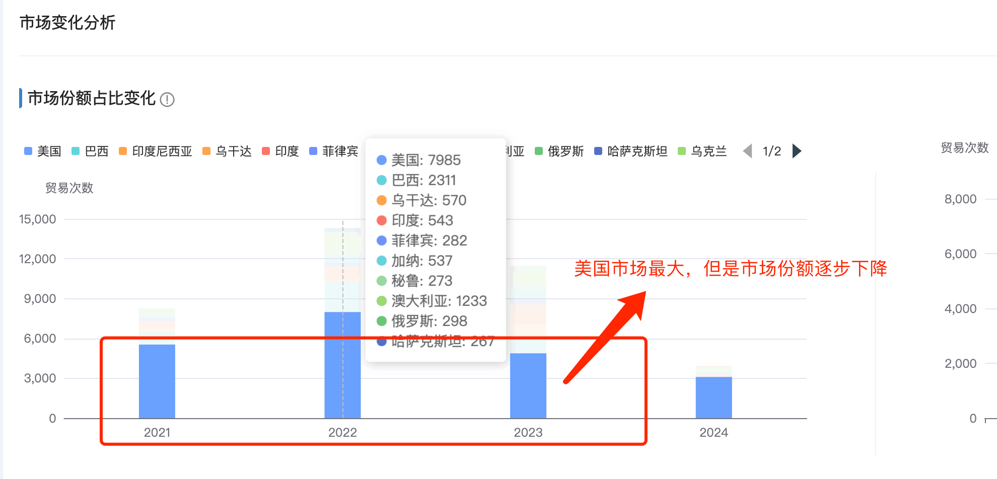 1. EVO视讯官网商情洞察市场分析新增「市场占比变化分析」:分析每年的头部市场的占比排名和变化,哪些市场持续排名在头部,哪些市场排名逐渐下滑甚至消失在top之外的。